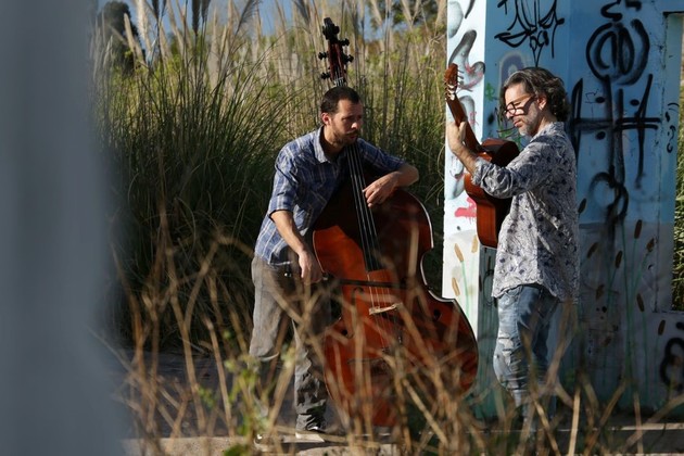 Nico por ejemplo, percutiendo la zona grave del bajo. Yo, haciendo las partes agudas, como imitando a veces a instrumentos de percusión, qué cosas podíamos tocar con el arco, qué cosas en pizzicato o cuando la guitarra por ejemplo imita a una subdivisión de tambores de candombe.