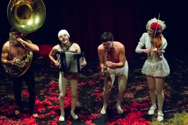 Martín con su característico saxo soprano curvo, junto a la compañía Les Rois Vagabonds, quienes lo invitaron a compartir su espectáculo (en la foto, en La Spezia, Italia) y lo recomendaron con Akoreacro. Foto: Gentileza Enrico Amici