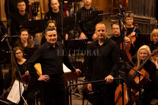 Gentileza de los artistas Banegas y Varela en el podio, con los músicos ucranianos al fondo: ambos artistas destacan la calidad de los integrantes de la Filarmónica.