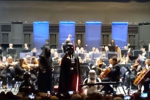 En ese momento Viegas abandonó el escenario, cuando irrumpieron el emperador Palpatine y Darth Vader, escoltados por un Stormtrooper, un piloto imperial y el mismísimo Bobba Fett. Usando la Fuerza, “obligaron” al director (quien se prestó al pase histriónico de los cosplayers) a conducir la Marcha Imperial (tema del Lado Oscuro). Con la aparición de Obi-Wan Kenobi, Luke Skywalker, Han Solo, Leia Organa, el Mandaloriano y otros héroes (reestableciendo el balance de la Fuerza), llegó el momento de “Ocaso binario” (tema de la Fuerza), para terminar nuevamente en el motivo triunfal.