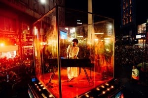 Frente a más de 3.000 personas, Ramma transformó la Avenida Corrientes en un escenario a cielo abierto para presentar “RV”, su último álbum con colaboraciones internacionales como Kid Voodoo (Chile) y Lia Kali (España). Dentro de una caja de cristal gigante, el artista profundizó la narrativa conceptual del disco, retomando la experiencia íntima que había presentado previamente en una pre escucha sold out en el Complejo C.