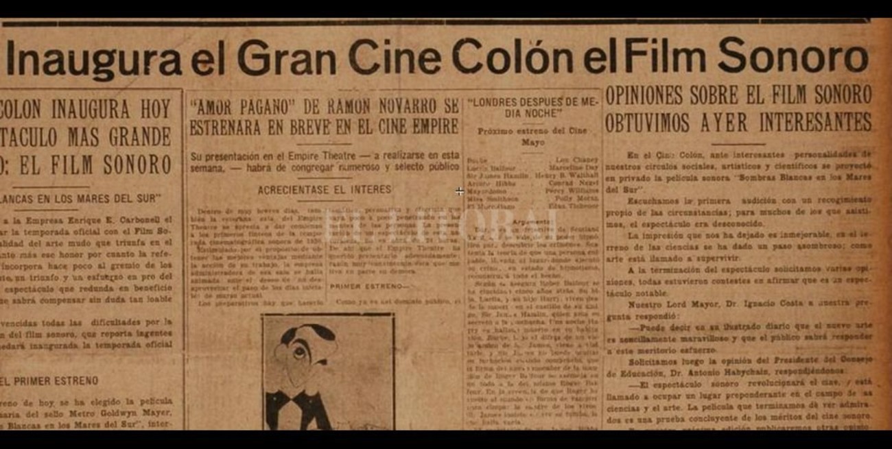 En su edición del miércoles 19 de marzo, El Orden publicó una breve crónica titulada “El cine Colón inauguró la temporada cinematográfica con el film sonoro con un éxito sin precedentes”. En uno de los tramos del artículo, el cronista señaló: “El interés que la nueva presentación de esta modalidad del cine ha despertado en nuestros círculos no se vio defraudada. Pues muy al contrario, con un interés único fue seguida la acción del film teniendo el público la impresión de asistir a una verdadera representación teatral en un grandioso escenario. Los ruidos de la acción, las canciones de los polinesios, el canto de los pájaros, la fuerza del viento y de las aguas de una impresionante realidad hicieron olvidar por completo a los espectadores que se hallaban ante una pantalla o representación cinematográfica”. Y agregó: “nuestra sociedad toda ha desfilado ayer por el cine Colón admirando este alarde de la ciencia que le ofrece en primicia la empresa de Don Enrique E. Carbonell”.