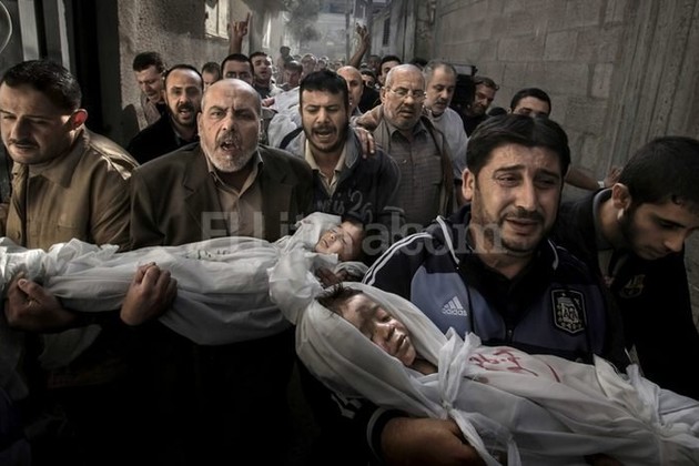 Los niños, dos hermanos de dos y tres años de edad, aparecen amortajados en primer plano, mientras que por detrás les sigue el cuerpo de su padre. Los tres murieron al quedar su casa destruida en un ataque israelí con misiles, en tanto que la madre fue ingresada en cuidados intensivos.