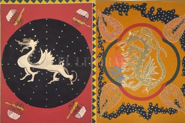 “El estudio de la iconografía del dragón en la Historia del Arte aporta una extensa variedad de formas, nombres y características particulares que son recreadas sumando la estética de los libros iluminados, escritos y pintados a mano por copistas de distintas congregaciones religiosas durante la Edad Media. Una característica que se ha tomado es el uso del dorado y el azul, así como las guardas, marcos y letras capitales. El collage también es partícipe de la obra incorporando un juego de texturas y colores que le aportan un costado moderno a la obra”, agregó la artista.