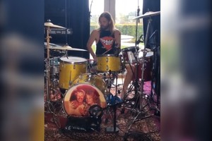 En el video se lo ve en su "estudio de batería", filmado de forma casera y con los pies de un niño que aparece a un costado, colgado de un sillón.