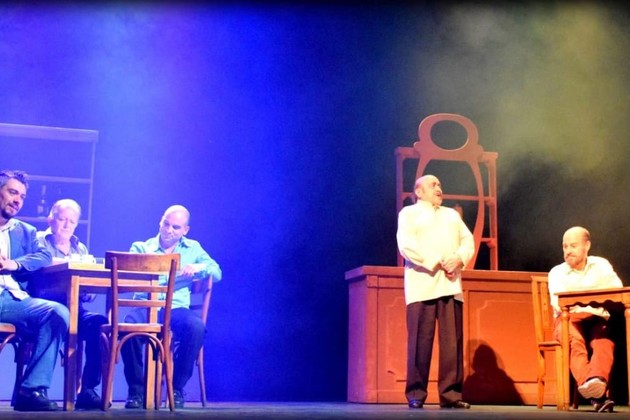 Quico Saggini encarna el papel de Roberto Fontanarrosa y Dali López a Jorge Luis Borges quienes son acompañados de un gran elenco. Foto: Gentileza producción