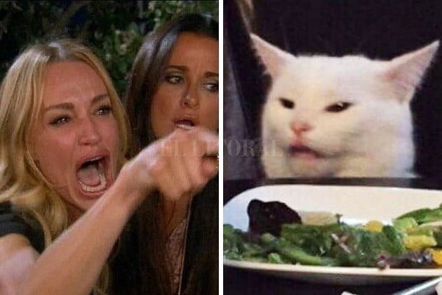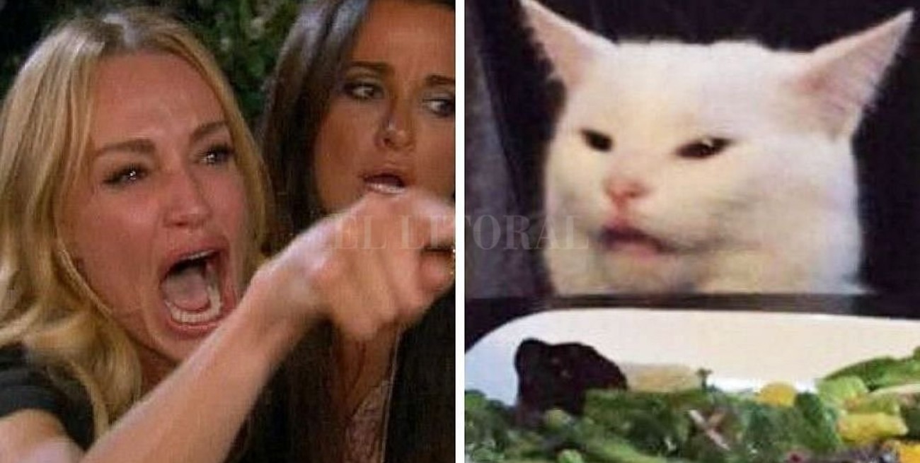 Una mujer gritando histérica. Un gato blanco sentado frente a un plato de ensalada. Es la receta del meme del momento. ¿Conoces la historia detrás de este meme?
