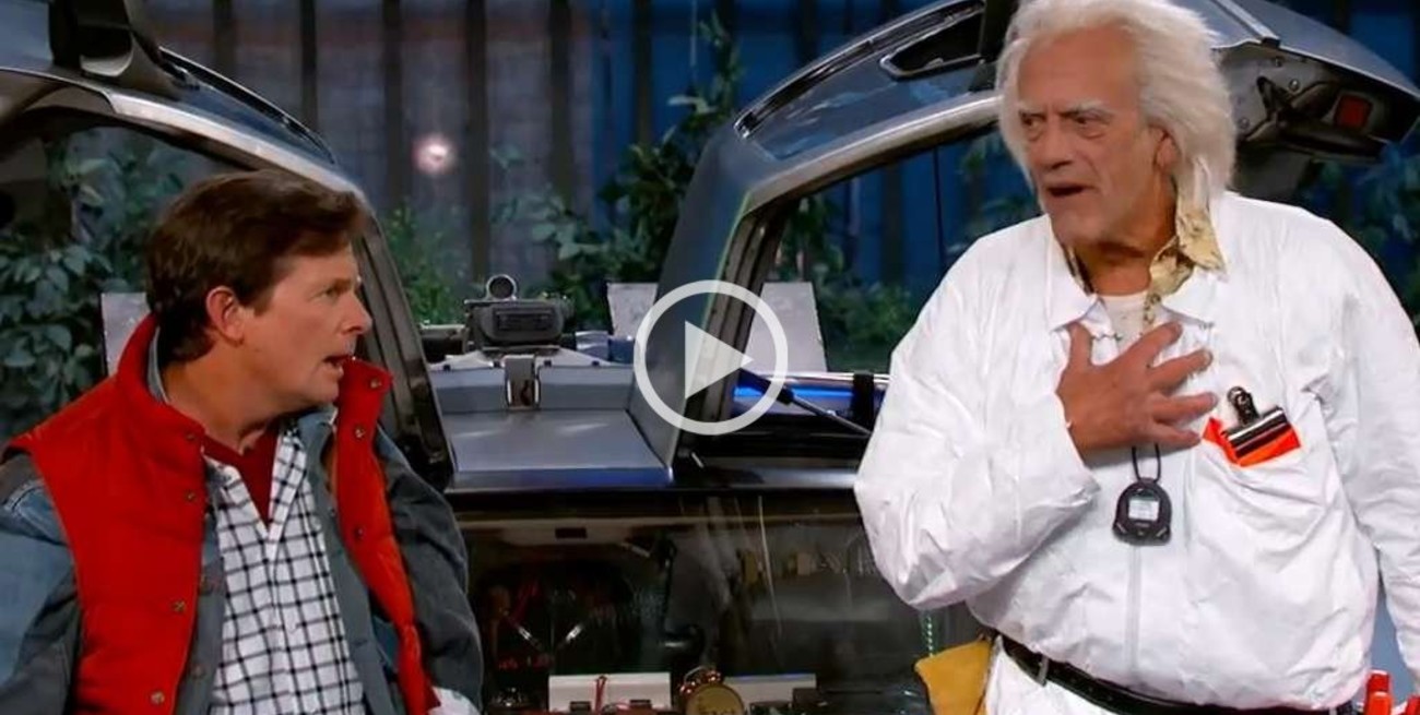 Los personajes ingresaron al estudio con el mítico DeLorean y bromearon junto al conductor del ciclo, Jimmy Kimmel, sobre las predicciones que se cumplieron y las que no.