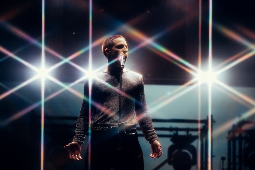 Bajo la intensidad para “Estímulo”, interpretando con todo el cuerpo (como un performer integral al que la cámara ama) eso de “Hay que aprender a convivir con lo ridículo”, entre luces rojas.