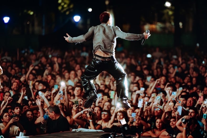 A la hora señalada, una pista monocorde activó las pasiones, hasta que muchos corearon “el que no salta votó a Milei”. A las y 20 se activó la maquinaria, entre sonidos industriales. La banda apareció entre guitarras rockeras y teclados de pop ochentoso a cargo de Francisco “Mariscal” Azorai, esperando a Wos para abrir “Nuevas coordenadas” con voz sutil. Rapado, de remera manga de lúrex plateado y pantalón de cuero tuvo la primera ovación de la noche.