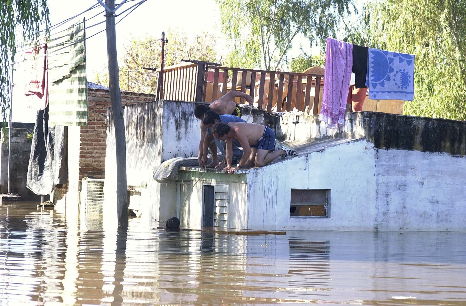 14 / 17 Con el agua casi en el techo. Jueves 1º de Mayo de 2003. Por temor a los saqueos, los vecinos resistieron arriba de los techos. Foto: AFP/ Ari Burafi