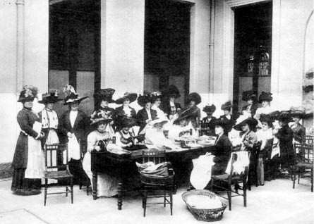 Mujeres bordando (1918). Damas de la alta sociedad porteña que se dedicaban a la beneficencia. Foto. Revista Ñ (Clarín).