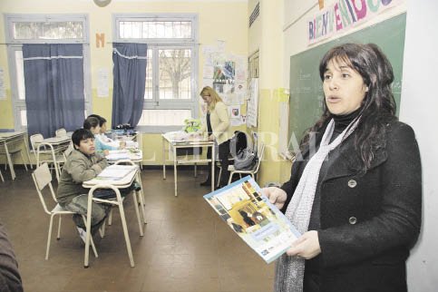 La maestra Carolina Serasuolo, con el manual en la mano, opina que sería interesante incorporar a la currícula escolar contenidos tales como la inundación, causas, consecuencias, entre otros. Foto: Guillermo Di Salvatore