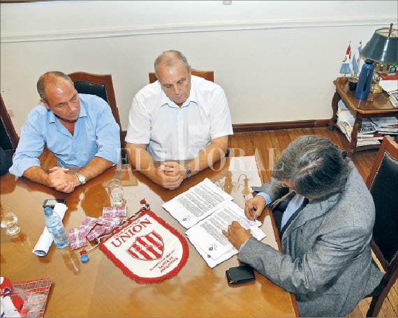 Los dirigentes de Unión, Luis Spahn y Jorge Molina, junto al ministro de Desarrollo Social, Pablo Farías. En el marco de la Copa América, la entidad recibió 500.000 pesos para obras. Foto: Flavio Raina