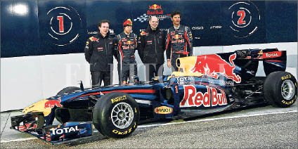 Arriba. Red Bull sigue siendo el equipo a batir. En la primera parte de esta jornada, Mark Webber fue el más veloz. En la toma, Horner, Vettel, Newey y el australiano. Foto: Agencia EFE