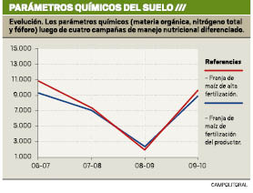 Evolución. Los parámetros químicos del suelo (materia orgánica, nitrógeno total y fóforo) luego de cuatro campañas de manejo nutricional diferenciado. Línea roja: franja de alta fertilización, línea azul: franja de fertilización de productor. fotos: gentileza