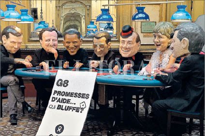 Los siete “cabezones” representan a cada uno de los líderes del Grupo de los Ocho (G8), la sociedad integrada por los países más poderosos del mundo, reunidos en torno a una mesa de póker, organizada en una casa de juegos de París por la ONG Oxfam. La organización pretendió teatralizar su denuncia de que los mandatarios practican una “economía de casino” y especulativa con el dinero que debería destinarse al auxilio de las economías en desarrollo a la vez que exige que cumplan con los compromisos adquiridos ante la comunidad internacional. Todo esto, pocos días antes del comienzo de la reunión del G8 en Deaville (Francia).