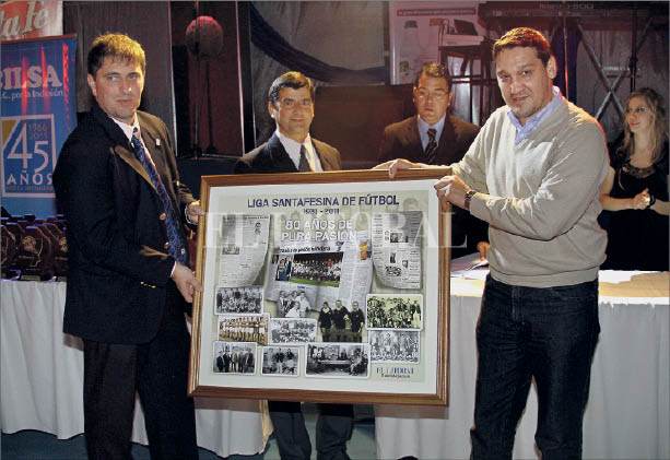El Litoral siempre estuvo presente Gastón Dubois le entregó a Carlos Lanzaro una bandeja y un cuadro donde se refleja, en imágenes, toda la historia de la Liga Santafesina. Nuestro Diario siempre acompañó a la casa mayor del fútbol local. Foto: Pablo Aguirre