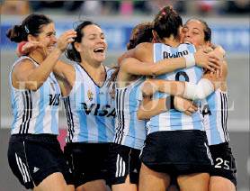Todas con “Lucha”. Un ritual que esperemos siga repitiéndose en Las Leonas: las compañeras, celebrando un tanto de la notable jugadora rosarina.