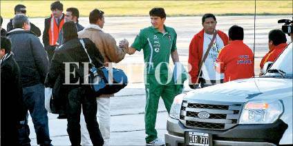 “Hola Pedrito, ¿cómo estás?”. Ronald Raldes saluda a Eusebio, el dirigente sabalero que, ubicado al pie del avión, recibió a la delegación boliviana y saludó al jugador de Colón. Foto: Flavio Raina