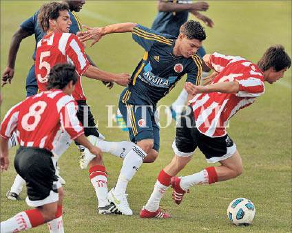Los juveniles de Unión presionan e intentan quitarle la pelota al colombiano Teófilo Gutiérrez durante el entrenamiento de la selección cafetera, ayer en el 15 de Abril.