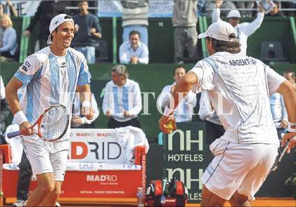 Juan Ignacio Chela celebra en el partido de dobles de ayer, junto a Eduardo Schwank. Esta mañana, ganó el cuarto punto para el equipo albiceleste. Foto: EFE