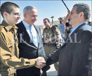 El ministro de defensa israelí Ehud Barak saluda al soldado Gilad Shalit y el primer ministro israelí Benjamin Netanyahu en la Base Aérea de Tel Nof.