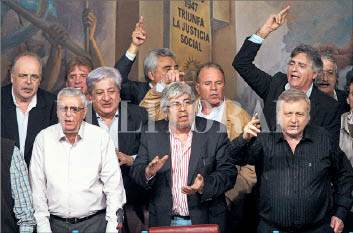 “No nos vamos a apartar un centímetro de esto, este es el mejor mensaje en este día”, señaló. Moyano se mostró en el escenario acompañado, entre otros, por Omar Maturana (La Fraternidad), Andrés Rodríguez (UPCN), José Luis Lingeri (Obras Sanitarias), Amadeo Genta (Municipales), Facundo Moyano (Peajes), Guillermo Pereyra (Petroleros Privados), Jorge Pérez Tamayo (Apla), Omar Suárez (Marítimos) y Mario Manrique (Smata).