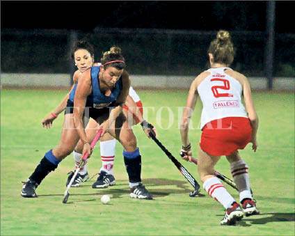 Muy disputado. Ana Milo (Universitario), una de las jugadoras destacadas del encuentro, maniobra ante la marca de dos defensores de Talleres de Paraná.