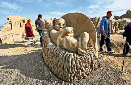 Imagen del tradicional pesebre monumental de arena que se realiza ya en su duodécima edición en la playa de La Pineda de Vila-Seca, en Tarragona. Si la marea, la lluvia y las tormentas lo permiten, sus hacedores dicen que se podrá ver hasta el próximo 9 de enero, día en que será destruido. Para su construcción los ocho artistas participantes utilizaron 600 toneladas de arena. El conjunto mide 20 metros de largo y tres de alto.