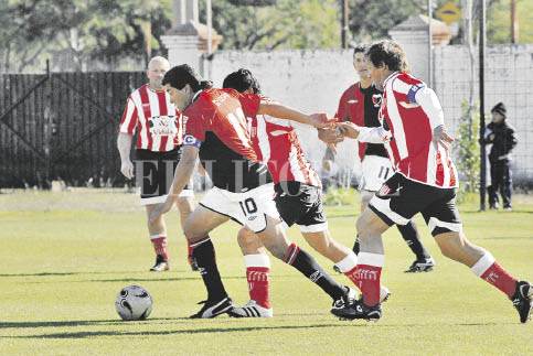 Juego discreto. Daniel Musso, de Colón, y Sergio Mauri, de Unión, disputan un balón en la cancha auxiliar del sabalero. Foto: Flavio Raina