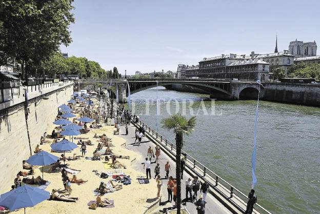 “París Playa” cumple su XI edición y un año más, miles de personas se acercan a orillas del Sena a broncearse cuando el esquivo sol parisino lo permite, con la Torre Eiffel, la Catedral de Notre Dame o el Pont des Arts como idílico paisaje de fondo.