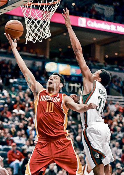 Carlos Delfino, de los Rockets, intenta convertir ante la presencia de John Henson, de Bucks. Foto: Agencia EFE