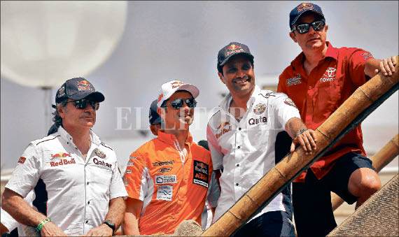 Protagonistas. Cualquiera de estos cuatro pilotos está en condiciones de llevarse esta edición del Dakar. Carlos Sainz, que regresa con un Buggy; Cyril Després (KTM), Nasser Al-Attiyah (Buggy) y el sudafricano Giniel de Villiers (Toyota) observan a la multitud desde una pantalla gigante. Foto: Agencia EFE