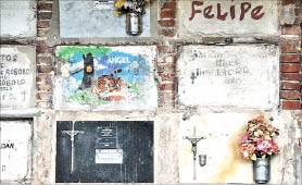 Y de nuevo, los nichos pobres y mal sellados con sus inscripciones rústicas que identifican los fallecidos se mezclan con el cobre de santos y vírgenes de las lápidas más ancestrales, sus fotos antiguas en blanco y negro, y las bocanadas de olor pútrido de los floreros. Desde la sección 100 hacia arriba -ubicadas en el sector sureste- la situación es la misma. El aleteo de palomas irrumpe otra vez y el ruido a la vida vuelve.