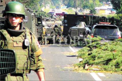 La policía despeja una de las rutas en Cañete que había sido cortada por los comuneros mapuches. Los enfrentamientos dejaron varios heridos en las últimas horas. Foto: Agencia EFE