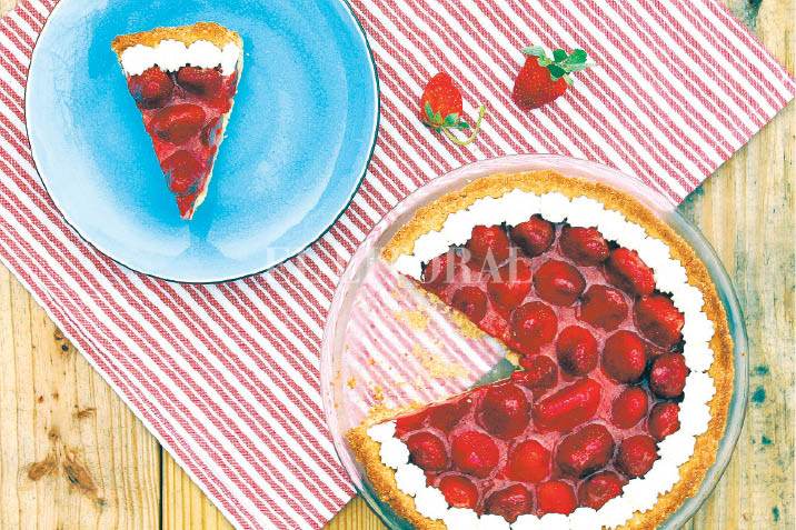 Armar el bizcochuelo. Cubrir el exterior con el resto de la crema chantillí. Por otro lado, remojar en agua fría cuatro sobres de gelatina sin sabor y luego disolver a baño maría. Exprimir el puré de las frutillas restante hasta obtener 1,4 taza de jugo y agregarlo a la gelatina disuelta. Colocar esta preparación en una cacerola y dejar cocinar a fuego lento revolviendo hasta que rompa el hervor. Retirar, dejar enfriar y volcar sobre el postre en forma despareja. Decorar la parte superior de la torta con algunas frutillas.