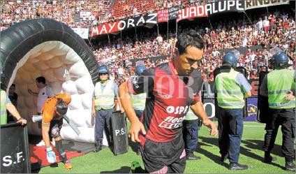 Lucas León Landa saltando al césped del Cementerio de los Elefantes con la camiseta de Colón. Llegó de la mano del “Yagui” Forestello y rápidamente se transformó en referente, titular indiscutido y capitán. Ahora, llevará esas condiciones al Alianza Lima de Perú que se cruzará con Huracán por la Copa Libertadores. Foto: Manuel Fabatía