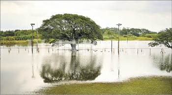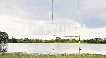 El agua aún permanece en vastos sectores del predio de Las Delicias. Como el caso de la cancha de hockey y la cancha número 3 de rugby. Fotos: Luis Cetraro