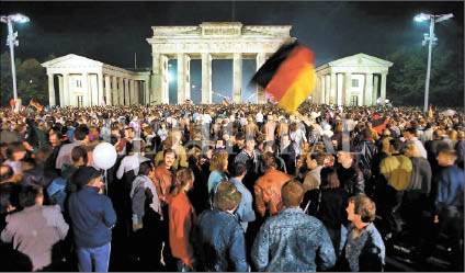 - 3 de octubre: A las 00.00 horas es izada la bandera negra, roja y gualda al son del himno nacional de la RFA delante del Reichstag, la sede del Parlamento de Alemania Federal. Cientos de miles festejan la reunificación en las calles de Berlín y muchas otras ciudades alemanas.