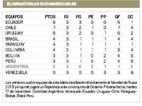 Con la victoria de Perú, sólo dos seleccionados se mantiene sin triunfos en la competencia: Venezuela, último sin unidades, y Argentina, penúltimo con dos puntos. En zona clasificatoria para el Mundial se ubican: Ecuador con 9 unidades; Chile con 7; Uruguay con 6; Brasil y Paraguay con 4. Colombia también tiene 4 pero se coloca sexto por diferencia de gol, mientras que Bolivia y los peruanos suman 3.