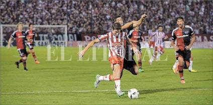 La jugada de los 3 puntos. Fue la última maniobra del partido. Soldano entró solo y apareado por Insúa, tenía ganada la posición y en vez de patear al arco, le tiró el cuerpo encima al defensor y se olvidó de la pelota. Foto: Agencia Rosario