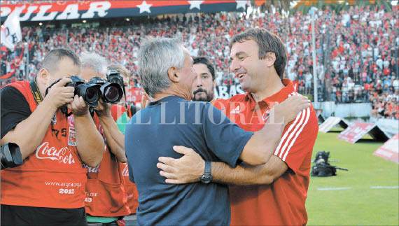 Leo y el “melli” Osella. Javier Osella es el hermano de Diego, no son mellizos pero tienen un notable parecido. Madelón lo saludó al hermano, pues el técnico de Newell’s lo vio desde el palco porque debía una fecha de suspensión. Foto: Agencia Rosario