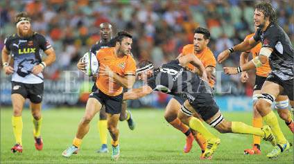 Martín Landajo desairó el esfuerzo de Niell Jordaan y Lod de Jager, direccionándose hacia uno de los ensayos argentinos. En apoyo, el rosarino Jerónimo De la Fuente. Foto: gentileza Prensa UAR