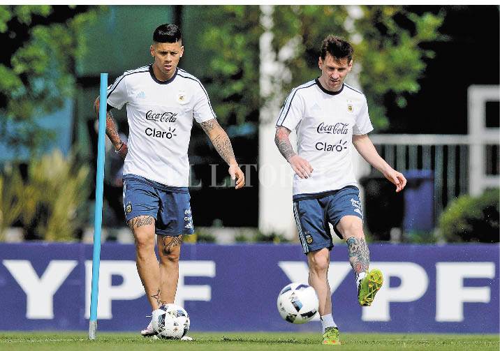 Esta mañana, la selección se entrenó en Ezeiza. Messi le pega a la pelota y Marcos Rojo observa.