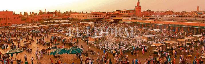Estamos frente a la mítica plaza de Jema el-Fnáa. Éste es uno de los pocos lugares del mundo donde todavía existen juglares y donde cada noche, en corro, las personas se reú-nen a escuchar historias.
