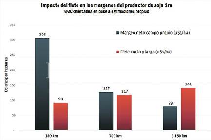 Comparando la erogación total en flete camionero con el margen neto en campo propio (luego de pagar todos los impuestos), para quien esté próximo a Rosario el flete representa el 30%; pero se eleva a un 92% en el caso intermedio y a un 177% para el más alejado. El informe destaca: “ese productor de Joaquín V. González (Salta) pagaría 141 U$S por hectárea en concepto de flete camionero y obtendría -luego de pagar todos los impuestos- apenas 79 U$S/ha de margen neto”, una cifran poco atractiva frente a “todos los riesgos que implica producir”. En campo alquilado, ese mismo indicador es de u$s101, u$s64 y u$s52 por hectárea, para las ubicaciones de 150, 700 y 1.150 kilómetros respectivamente.