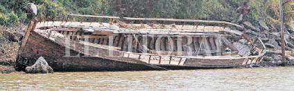 Se trata de un antiguo madero recostado sobre la costa del río Santa Fe. Su estructura de unos 20 metros de eslora todavía es identificable. Pero cuando crezca el río continuará sumergido rumbo a su deterioro final.