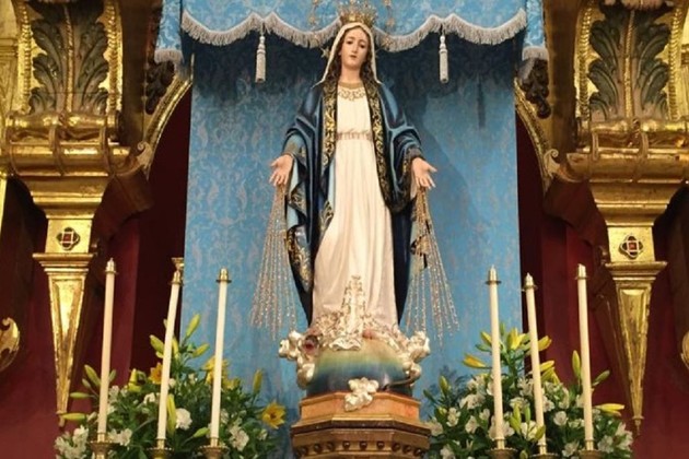 Según la historiografía católica, el 27 de noviembre de 1830, la Virgen se apareció a Santa Catalina Labouré, humilde religiosa vicentina. Venía vestida de blanco y junto a Ella había un globo luciente sobre el cual estaba la cruz. Abrió sus manos y de sus dedos salieron rayos luminosos que descendieron hacia la tierra.