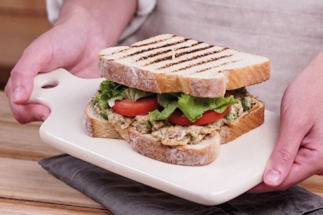 Sándwich de atún: Se elabora con 2 rebanadas de pan de molde, mayonesa, tomate, lechuga y atún.